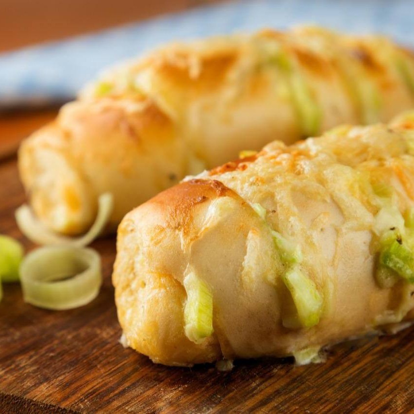 Experimente nosso Pão de Alho Recheado com Alho Poró, uma baguete crocante e perfeitamente assada, recheada com um saboroso creme de alho poró.