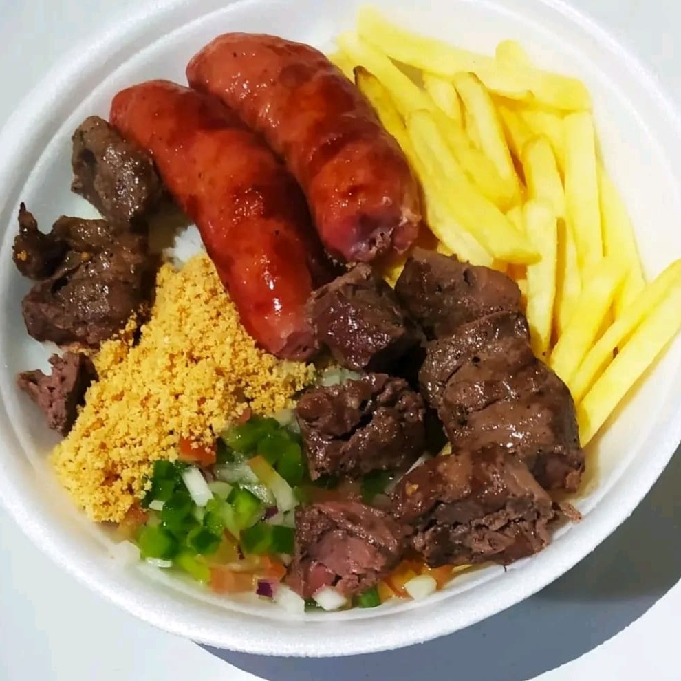 Quentinha completa com arroz, vinagrete, farofa, 2 espetos, escolha entre batata frita, maionese ou salpicão.