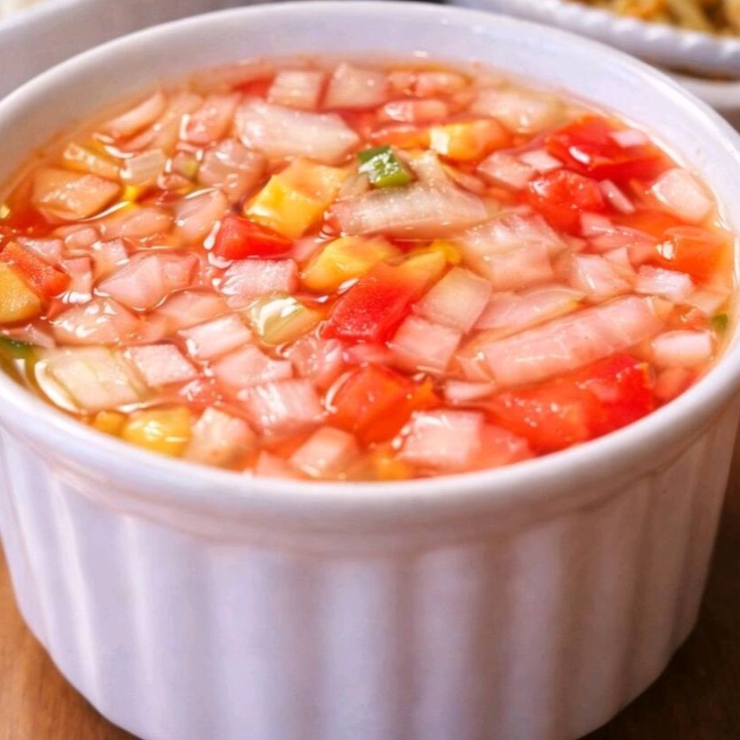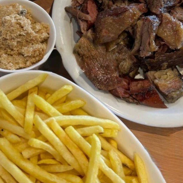 Aproximadamente 300g de churrasco misto, 3 cortes, acompanhado de maionese, farofa, vinagrete, batata frita e feijão opcional.