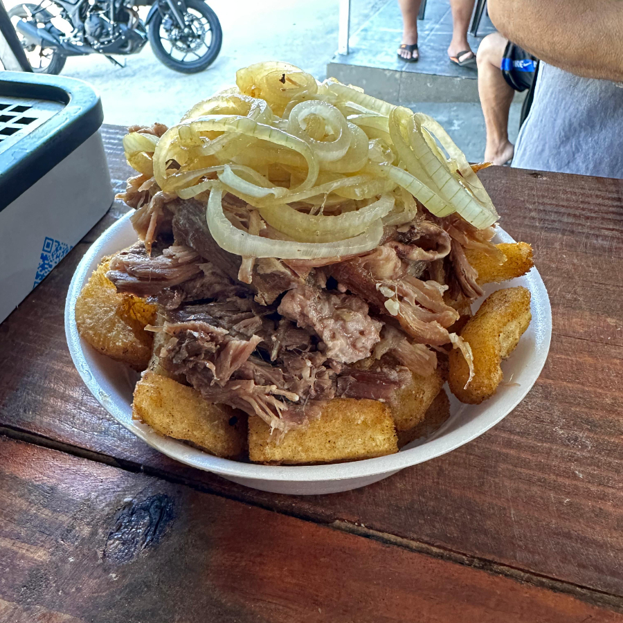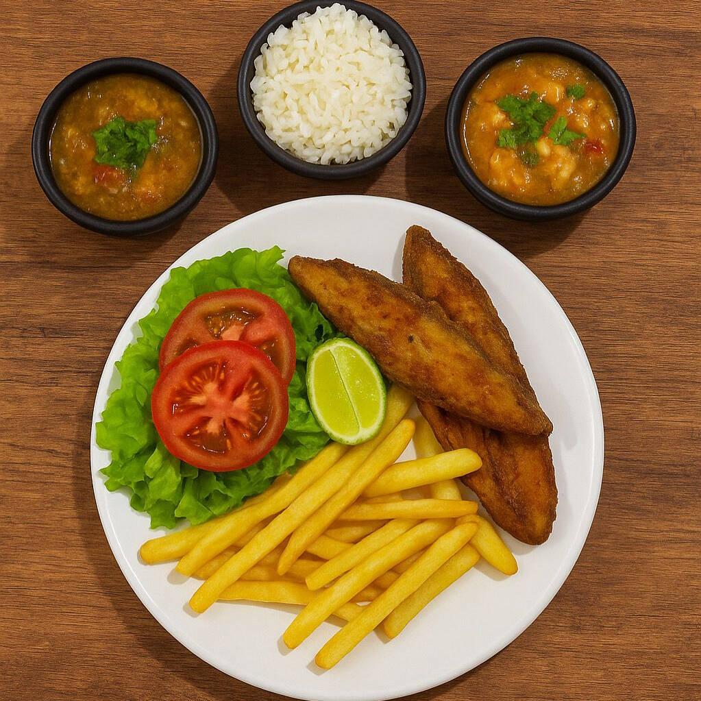 Acompanha arroz, pirão, salada e batata ou aipim.