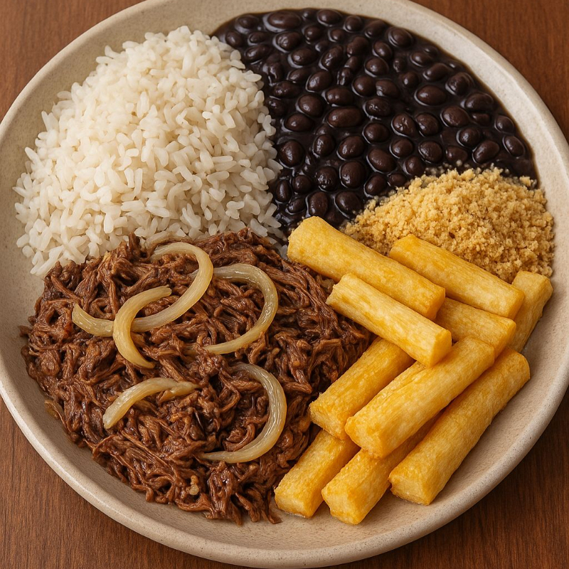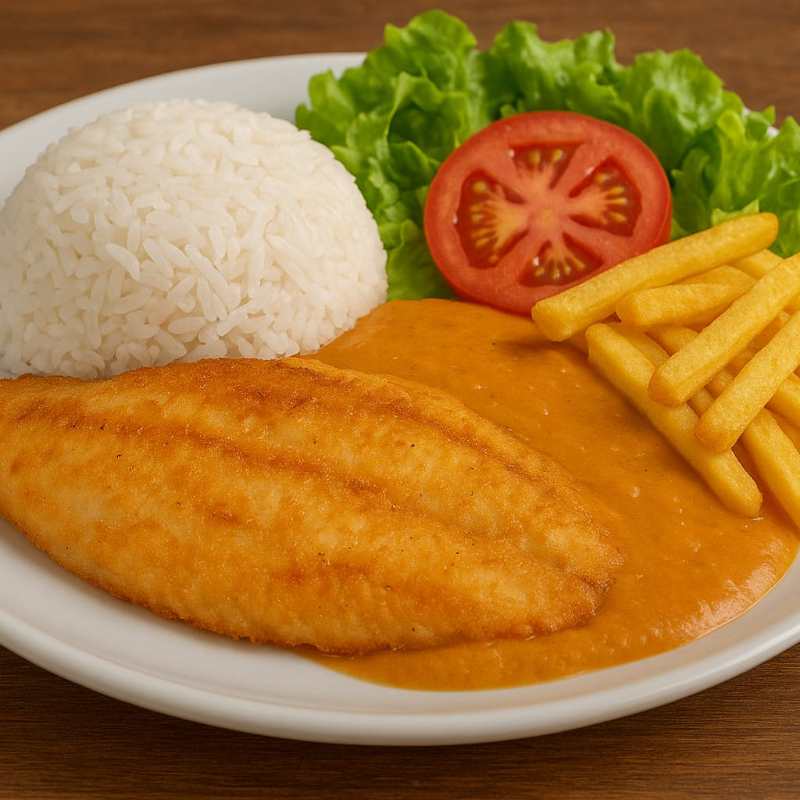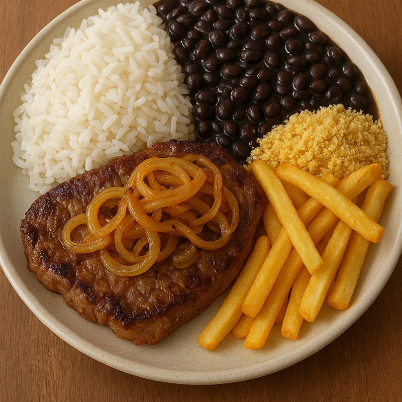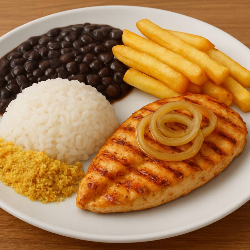 Acompanha arroz, feijão, salada, farofa e batata ou aipim.
