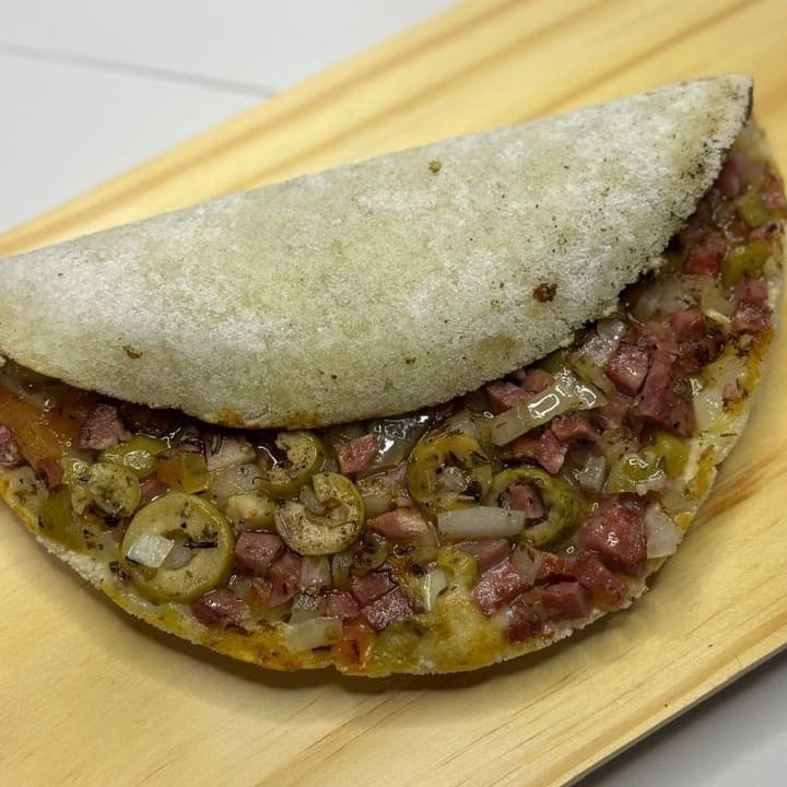 Recheada com queijo da sua preferência, calabresa, tomate, cebola, azeitona e orégano.
