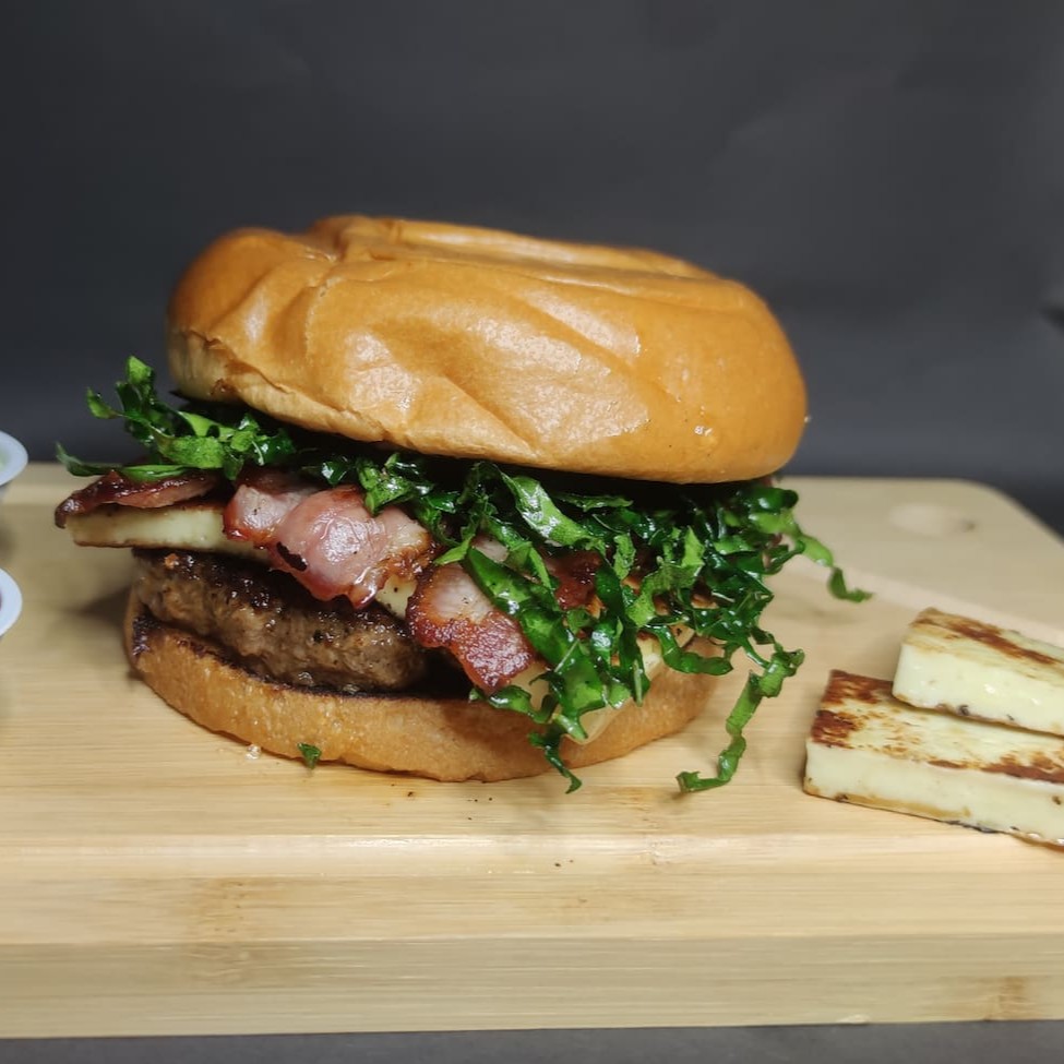 Pão brioche selado na manteiga com delicioso blend de 160g, queijo coalho frito, queijo muçarela ou prato, bacon crispy crocante, picles, crispy de couve e saborosa geleia de pimenta .__#hambúrguer #lanches #lasanha #sanduíche #fritas #esfirras #Soda #milkshake