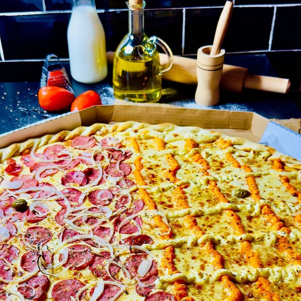 Metade Calabresa Acebolada com aroma marcante e sabor intenso, metade Frango com Catupiry super cremosa e suculenta. Uma pizza gigante, recheada generosamente e perfeita para reunir a família e matar a fome com muito sabor.