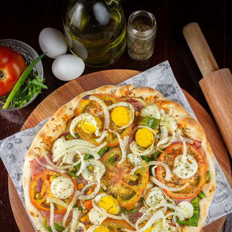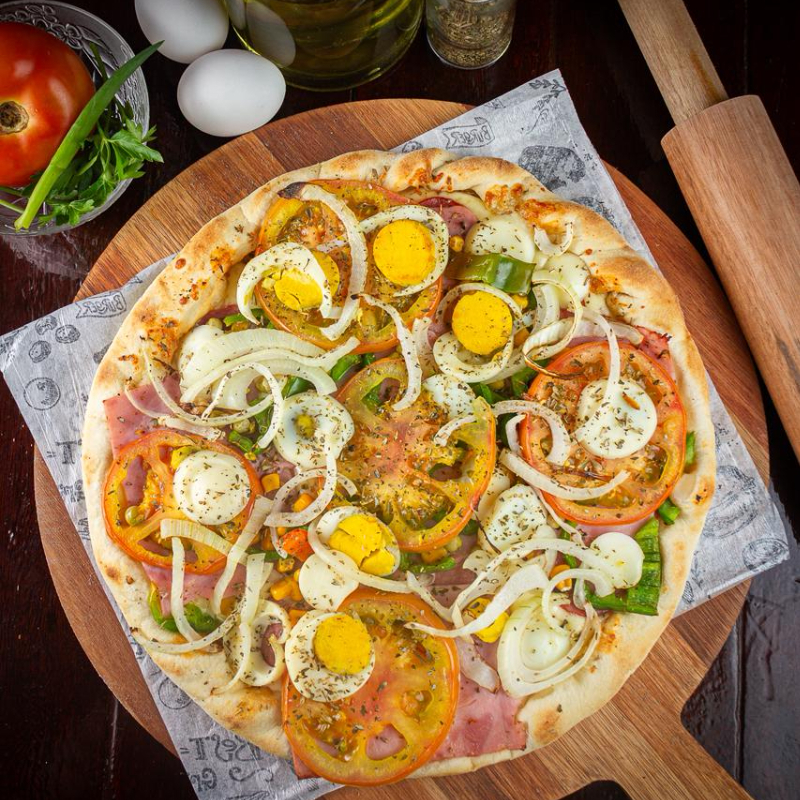Molho, mussarela, calabresa, presunto, tomate, pimentão, cebola, milho, ervilha, orégano e azeitona
