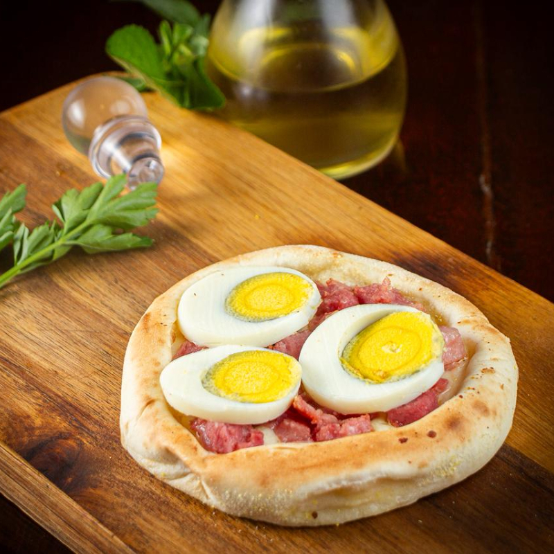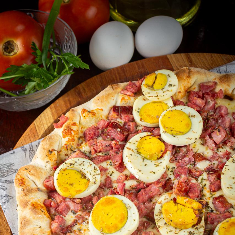 Molho, Mussarela, bacon, ovos, oregáno, azeitona
