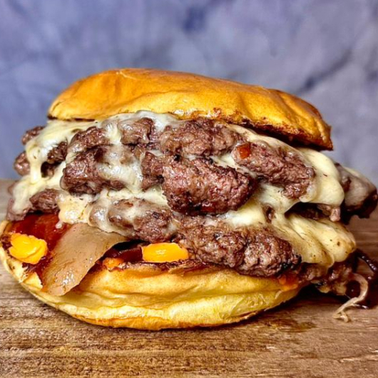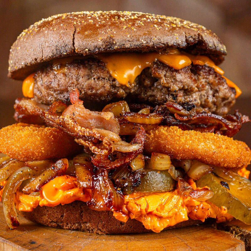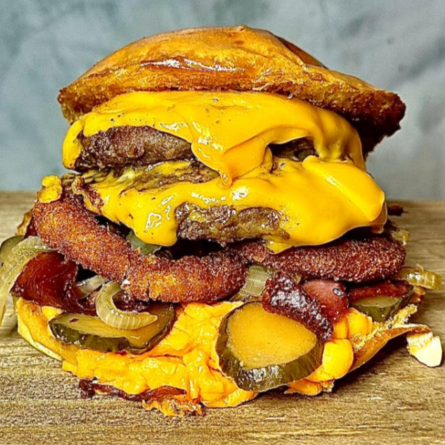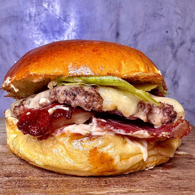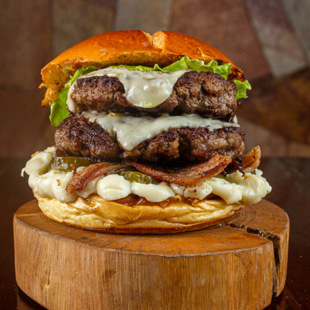 Pão brioche selado na manteiga com dois deliciosos blends de 160g, queijo cheddar, queijo muçarela ou prato, bacon crispy crocante, picles, cheddar cremoso, saborosa cebola caramelizada e cebola onion.__#hambúrguer #lanches #lasanha #sanduíche #fritas #esfirras #Soda #milkshake