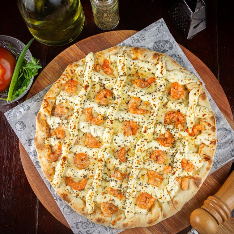 Molho, mussarela, camarão, catupiry, orégano e azeitona