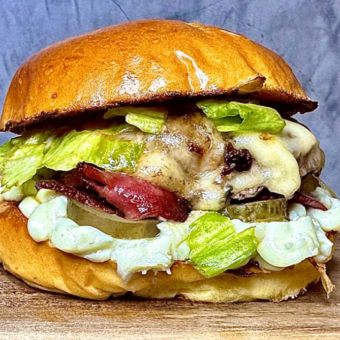 Pão brioche selado na manteiga com dois deliciosos blends de 130g, queijo cheddar, queijo muçarela ou prato, bacon crispy crocante, picles, saboroso creme de gorgonzola e alface__#hambúrguer #lanches #lasanha #sanduíche #fritas #esfirras #Soda #milkshake