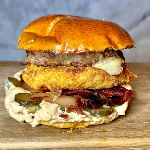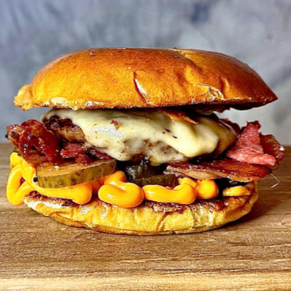 Pão brioche selado na manteiga com delicioso blend de 160g, queijo muçarela ou prato, bacon crispy crocante, picles, Catupiry Original empanado e cremosa maionese de bacon.__#hambúrguer #lanches #lasanha #sanduíche #fritas #esfirras #Soda #milkshake