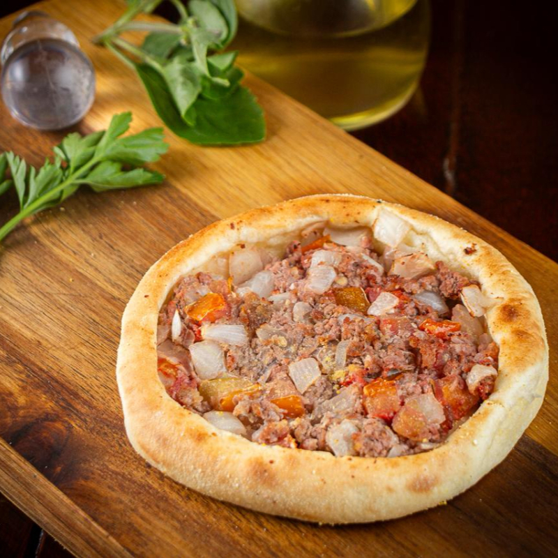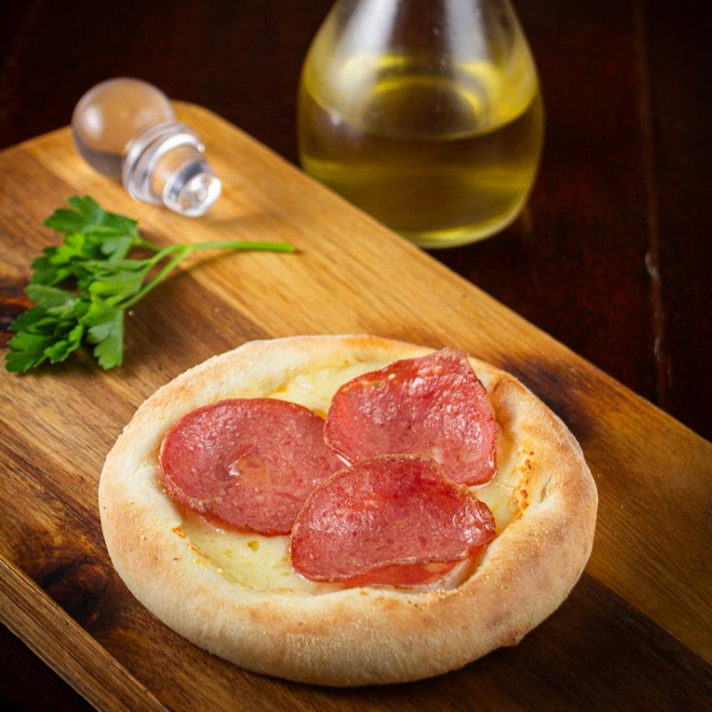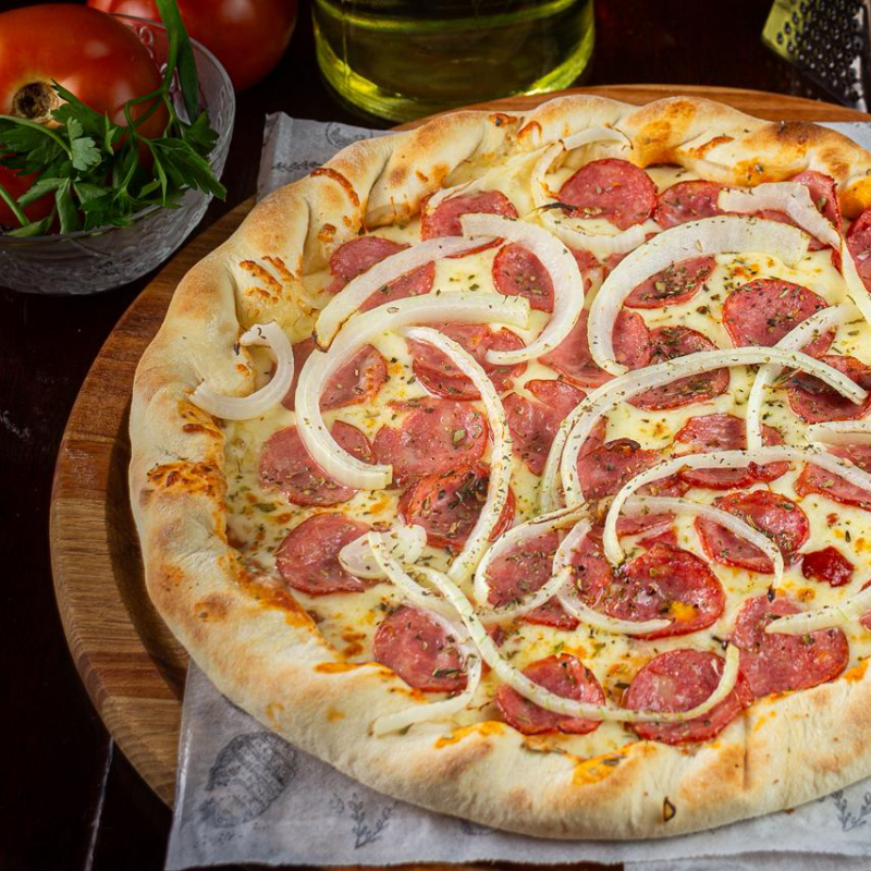 Molho, mussarela, calabresa, cebola, orégano e azeitona