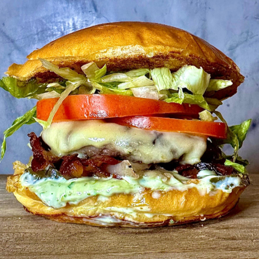 Pão brioche selado na manteiga com delicioso blend de 130g, queijo muçarela ou prato, bacon crispy crocante, picles, salada fresquinha de alface, tomate e cebola roxa, cremosa maionese verde.__#hambúrguer #lanches #lasanha #sanduíche #fritas #esfirras #Soda #milkshake