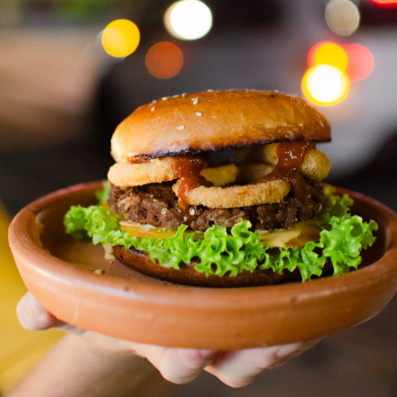 Fatias de focaccia artesanal e de longa fermentação, recheado com relish de tomate, fatias de tomate, alface e queijo azul vegetal