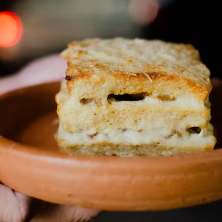 Fatias de focaccia artesanal e de longa fermentação, recheado com relish de tomate, fatias de tomate, alface e queijo azul vegetal