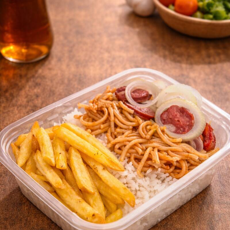 Refeição leve calabresa acebolada 75g com 3 acompanhamentos à sua escolha. Acompanhamentos disponíveis: Arroz Feijão Farofa Mix de salada (alface, repolho roxo e cenoura) Batata Macarrão Maionese Porção individual em embalagem de 500ml.