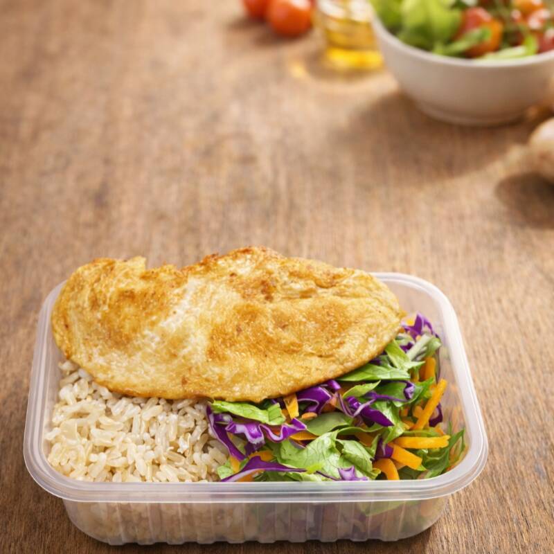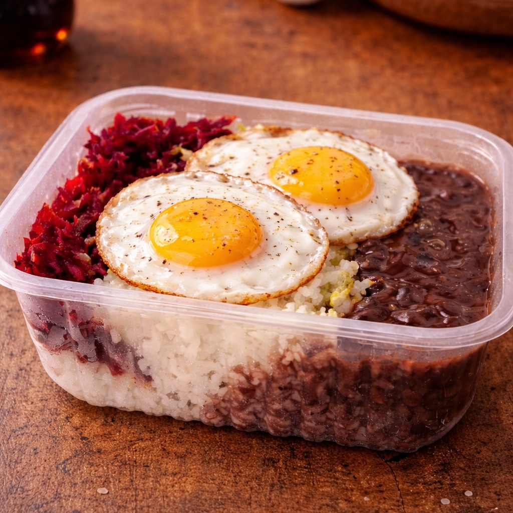 Refeição leve 2 ovos fritos com 3 acompanhamentos à sua escolha. Acompanhamentos disponíveis: Arroz Feijão Farofa Mix de salada (alface, repolho roxo e cenoura) Batata Macarrão Maionese Porção individual em embalagem de 500ml.