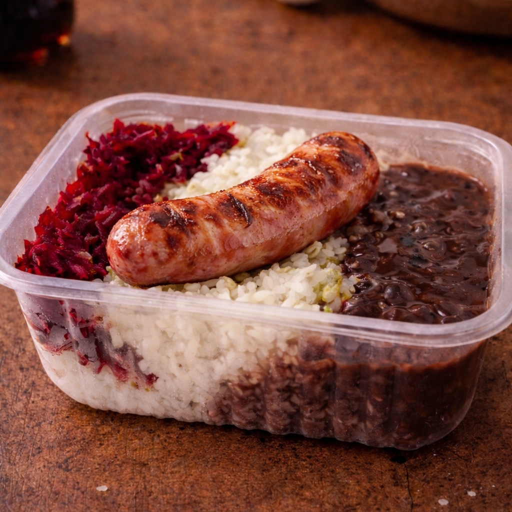 Refeição leve 1 linguiça toscana com 3 acompanhamentos à sua escolha. Acompanhamentos disponíveis: Arroz Feijão Farofa Mix de salada (alface, repolho roxo e cenoura) Batata Macarrão Maionese Porção individual em embalagem de 500ml.