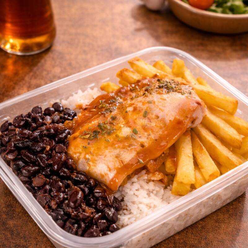 80g a 100g de Peito de frango grelhado, arroz (branco, integral ou com brócolis), feijão e legumes à sua escolha (cenoura, beterraba ou batata-doce). Uma refeição equilibrada, saudável e saborosa, ideal para o Dia a Dia.