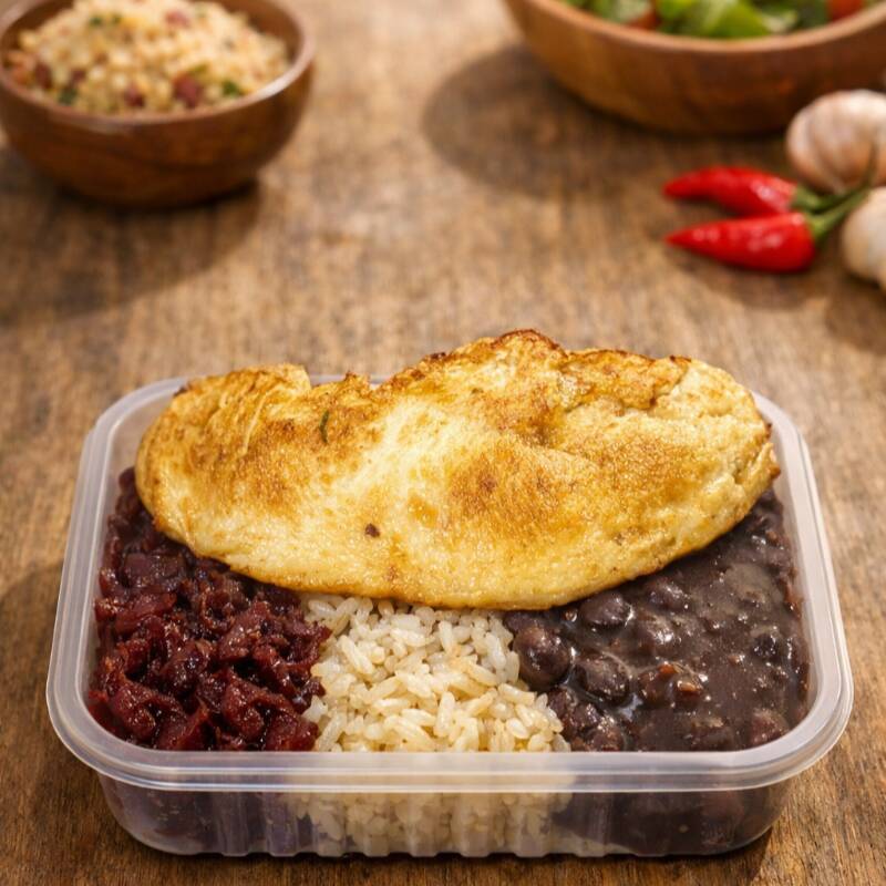 Prato com 2 ovos cozidos Uma refeição caseira e irresistível: Escolha 3 acompanhamentos entre eles, arroz soltinho, feijão fresquinho, farofa crocante, batata frita douradinha preparada com todo carinho da vovó. Simples, farto e cheio de sabor, do jeitinho que só nós sabemos fazer!