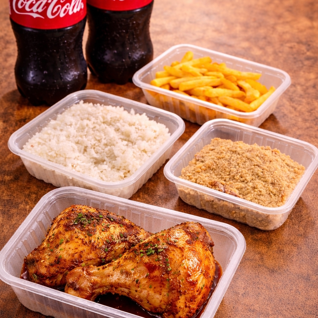 2 Sobrecoxas de frango bem temperadas e assadas até ficarem douradinhas por fora e suculentas por dentro. Acompanha 3 acompanhamentos à sua escolha + 2 bebidas para deixar a refeição completa. Ideal para dividir e aproveitar uma refeição caseira e bem servida!