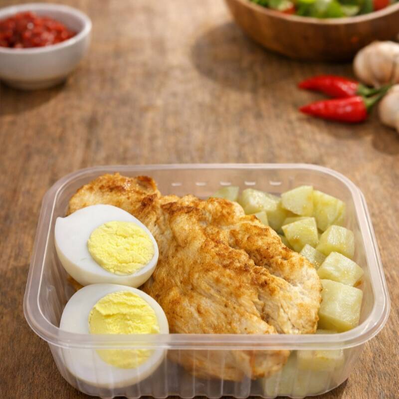 1 Peito de frango grelhado, 1 ovo cozido e batata-doce macia e saborosa. Uma refeição fitness, rica em proteínas e perfeita para quem busca energia e uma alimentação mais leve.