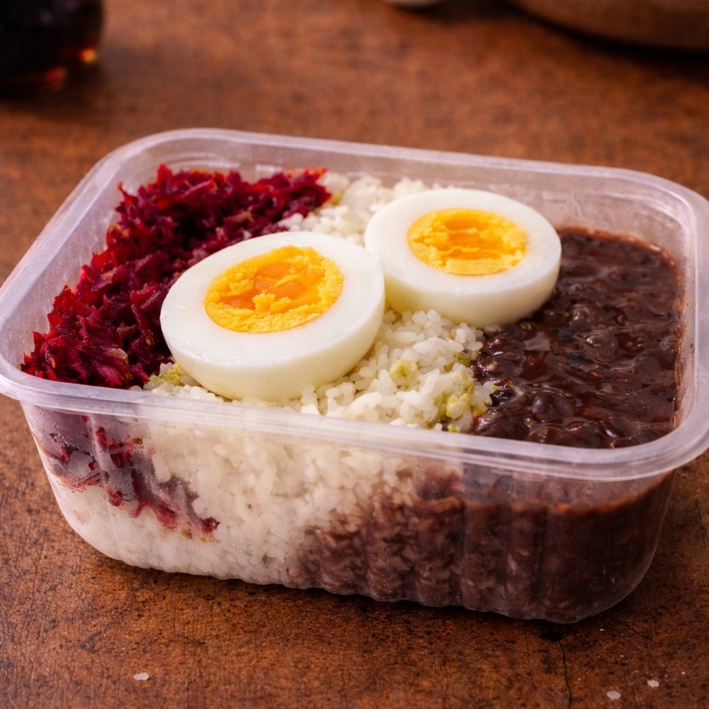 Refeição leve 2 ovos cozidos com 3 acompanhamentos à sua escolha. Acompanhamentos disponíveis: Arroz Feijão Farofa Mix de salada (alface, repolho roxo e cenoura) Batata Macarrão Maionese Porção individual em embalagem de 500ml.