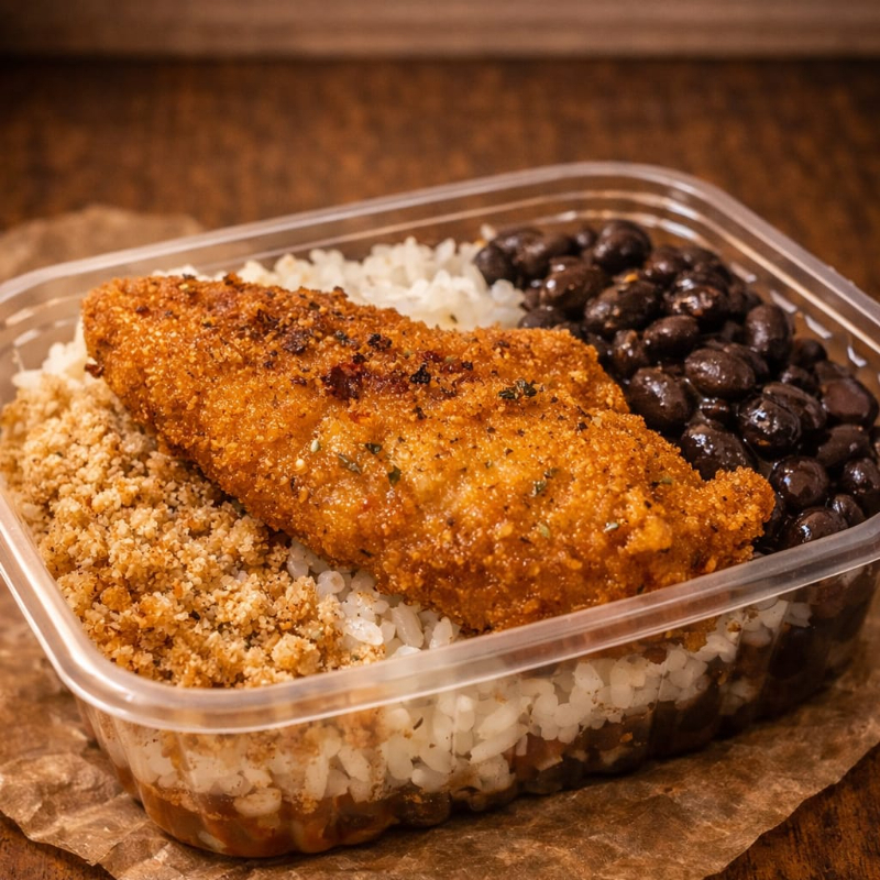 Refeição leve filé de frango empanado 80g com 3 acompanhamentos à sua escolha. Acompanhamentos disponíveis: Arroz Feijão Farofa Mix de salada (alface, repolho roxo e cenoura) Batata Macarrão Maionese Porção individual em embalagem de 500ml.