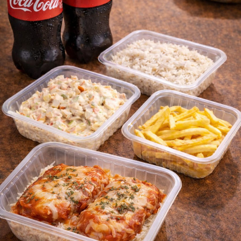 Parmegiana de Frango ou Bife bovino Parmegiana Uma combinação clássica e cheia de sabor: escolha 3 acompanhamentos entre, arroz soltinho, feijão fresquinho, farofa crocante, batata frita douradinha e frango empanado, cobertas com molho de tomate caseiro e queijo derretido. Um prato especial, cremoso e irresistível, preparado com todo o carinho da vovó para deixar sua refeição ainda mais marcante!