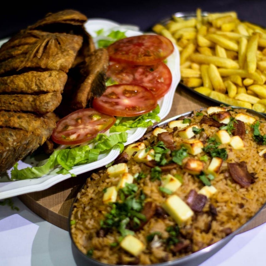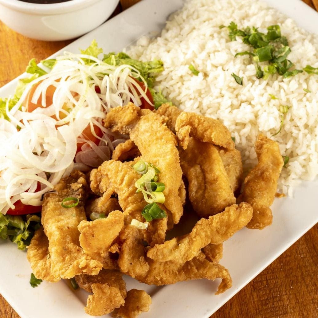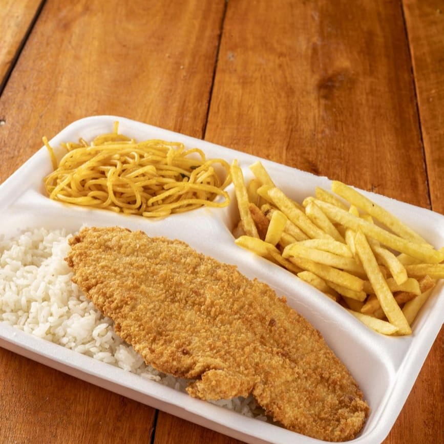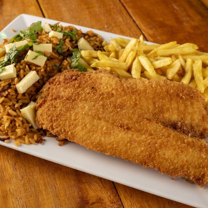 600 gramas de isca de peixe,500 gramas de fritas e salada