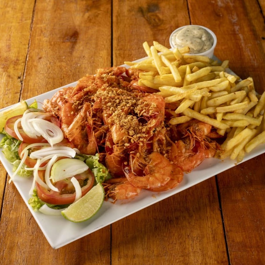 700 gramas de camarão,500, gramas de batata,salada e molho especial