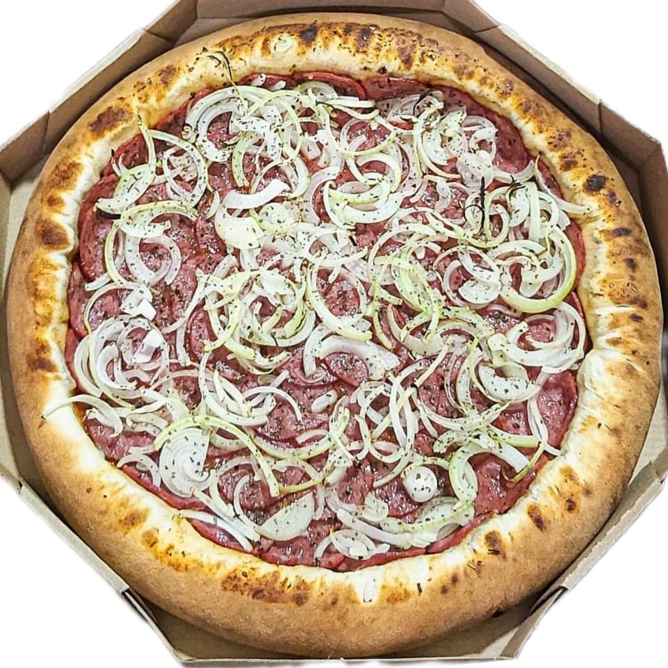 Massa Artesanal, Molho de Tomate Especial, Calabresa Fatiada e Cebola. Pizza não vai Queijo (Mussarela) Serve 2 Pessoas