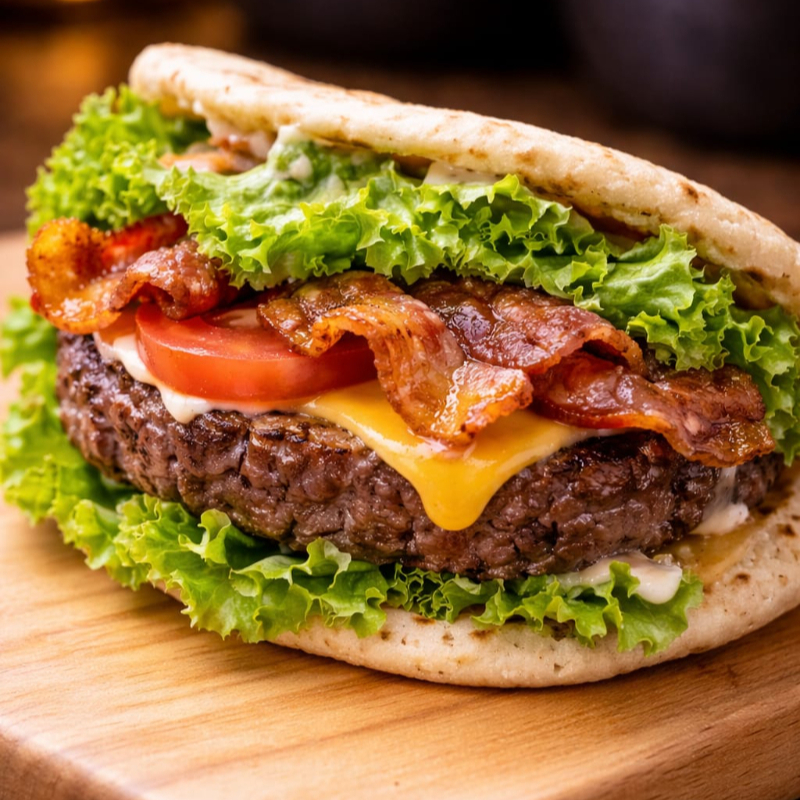 Pão sírio fresquinho recheado com frango grelhado crocante,ovo, queijo prato, cream cheese, maionese, alface, tomate e cebola roxa.