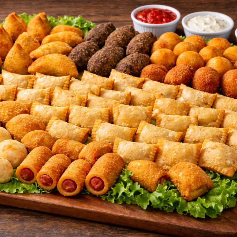 50 Salgados Sortidos + 20 Mini Pasteis Mistos