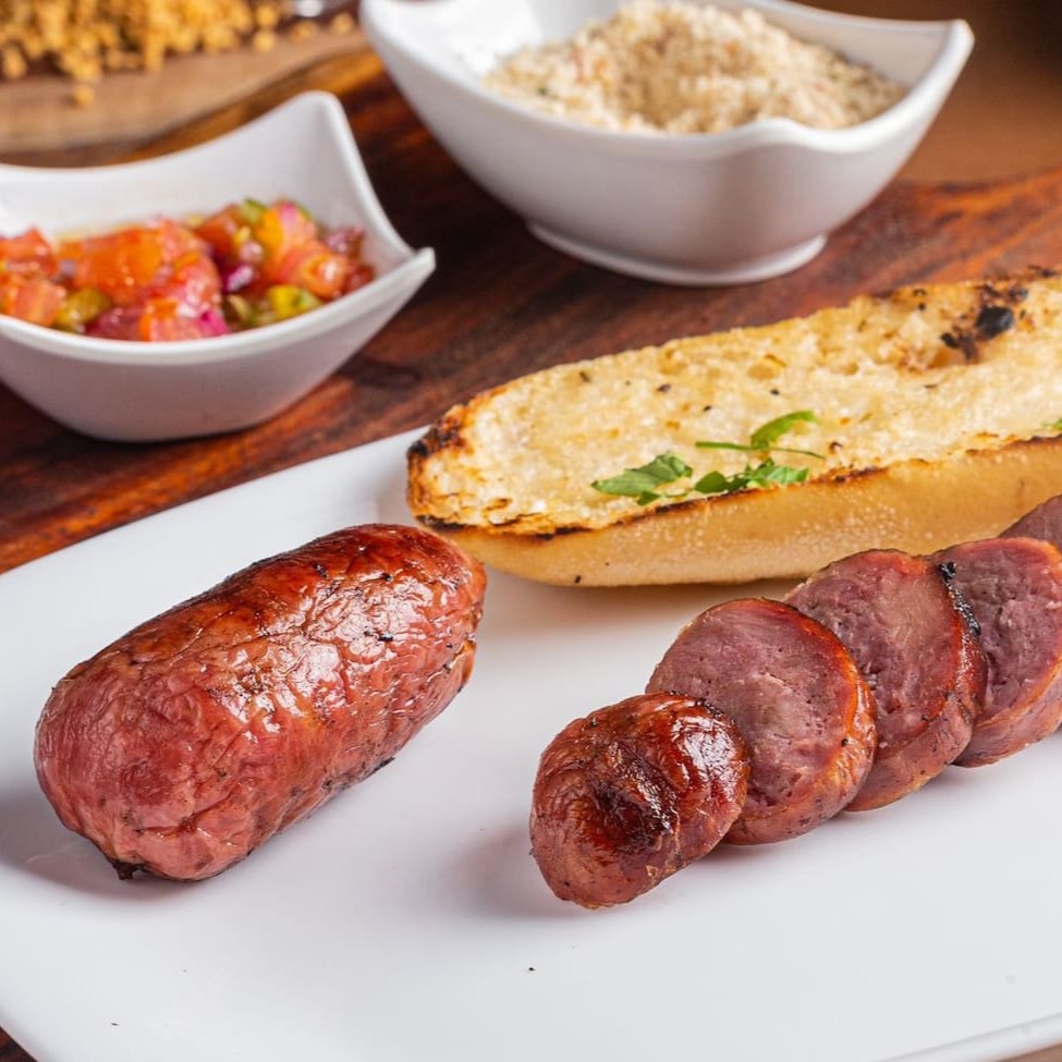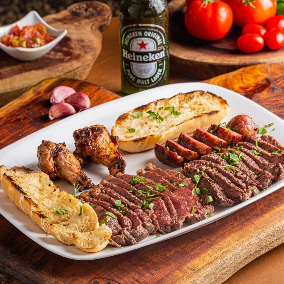 "2 drumets, 1 linguiça, em média 300g de coração da alcatra. Acompanhamentos= molho vinagrete, farofa e pão de alho. ""Porção generosa que inclui 2 drumets suculentos, 1 linguiça saborosa e cerca de 300g de coração de alcatra macio e bem temperado. Para complementar essa combinação irresistível, acompanham molho vinagrete fresquinho, farofa crocante e bem temperada, além do pão de alho douradinho por fora e macio por dentro. Uma experiência completa e deliciosa, perfeita para quem não abre mão de sabor e qualidade em cada mordida."""