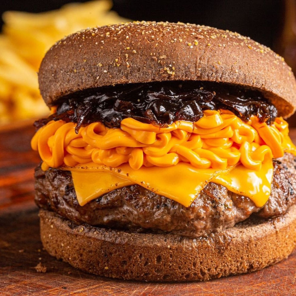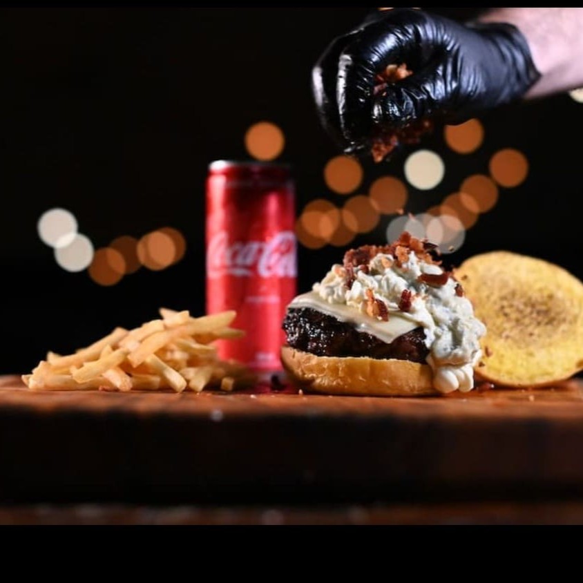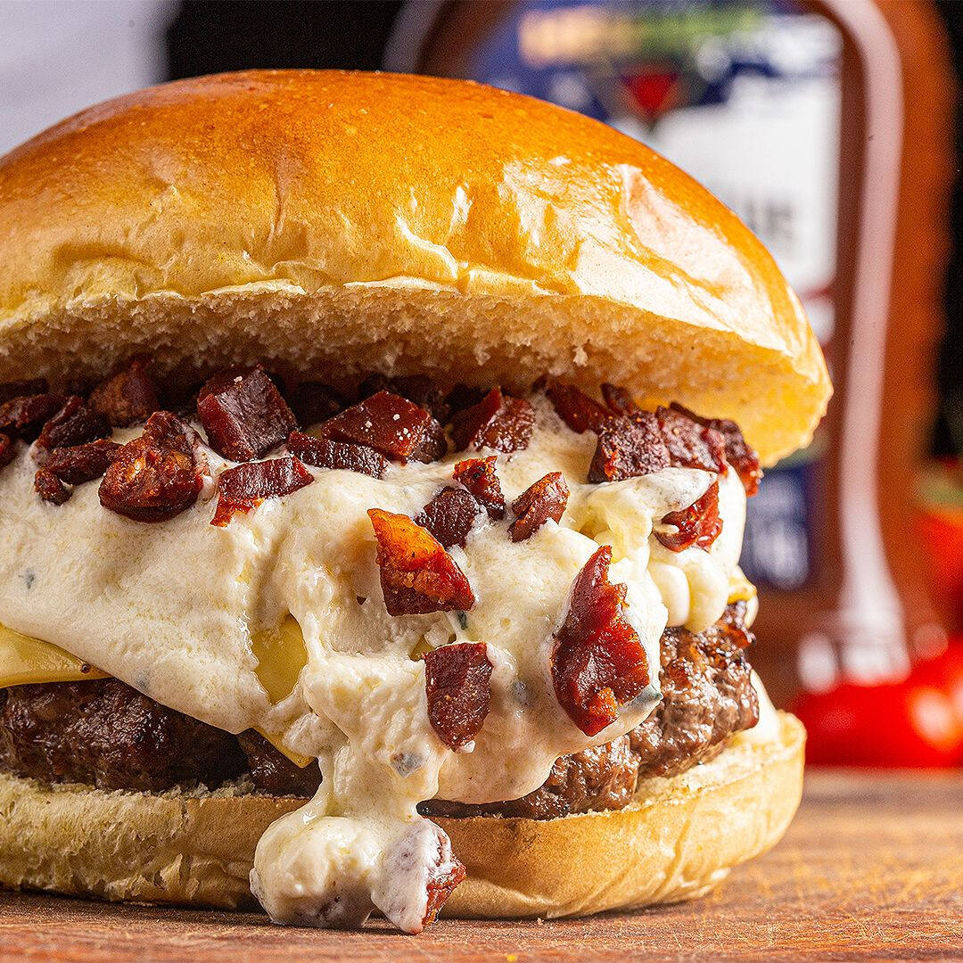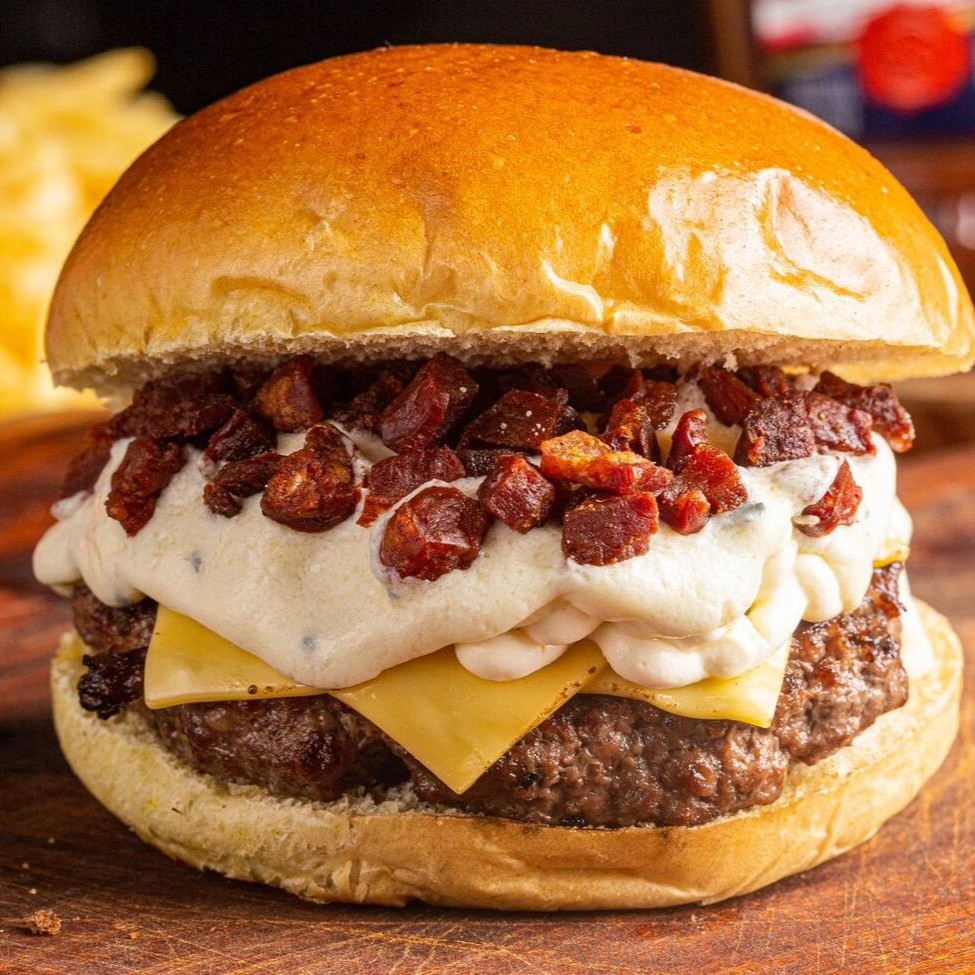 Blend Bovino (200g), fatia de queijo prato, queijo gorgonzola, cream cheese e farofa de bacon Uma explosão de sabores! Suculento blend bovino 200g, grelhado no ponto perfeito, coberto com fatia de queijo prato, o sabor marcante do gorgonzola e a cremosidade irresistível do cream cheese. Finalizado com farofa crocante de bacon, para um toque defumado e apaixonante. (Apenas o hambúrguer)