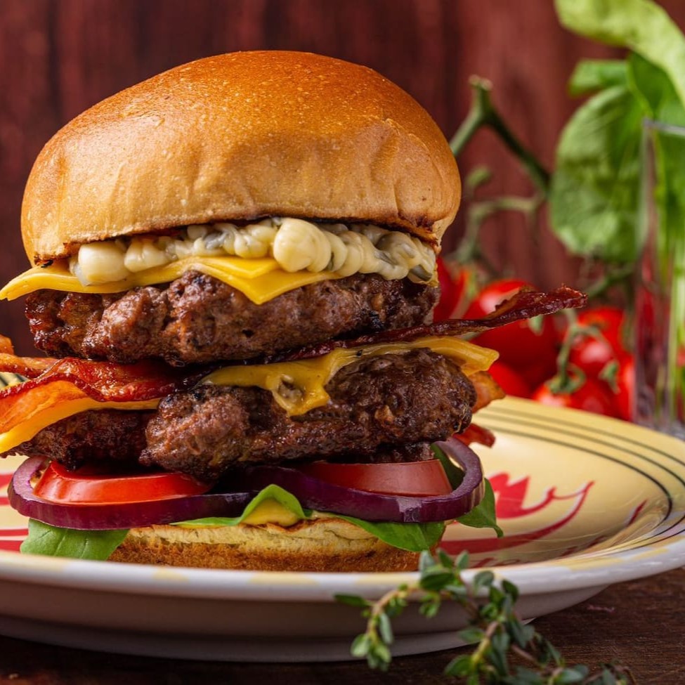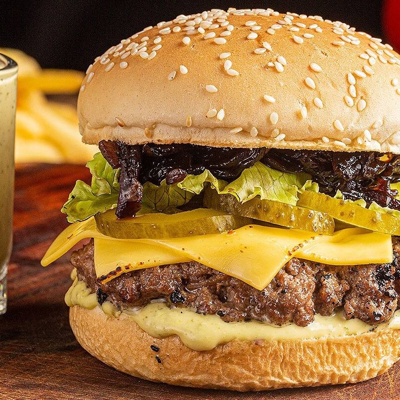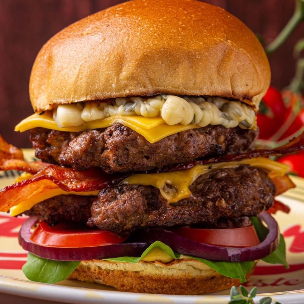 2 blends (120g), bacon em fatias, cebola roxa, rúcula, tomate, fatias de queijo prato, Catupiry e molho de mostarde e mel. Dupla de sabor irresistível! Dois blends bovinos de 120g cada, combinados com crocantes fatias de bacon, cebola roxa fresca, rúcula vibrante e tomate suculento. Acompanhado por fatias generosas de queijo prato, cremoso Catupiry e finalizado com um toque especial do molho de mostarda e mel que traz equilíbrio perfeito entre doce e picante.