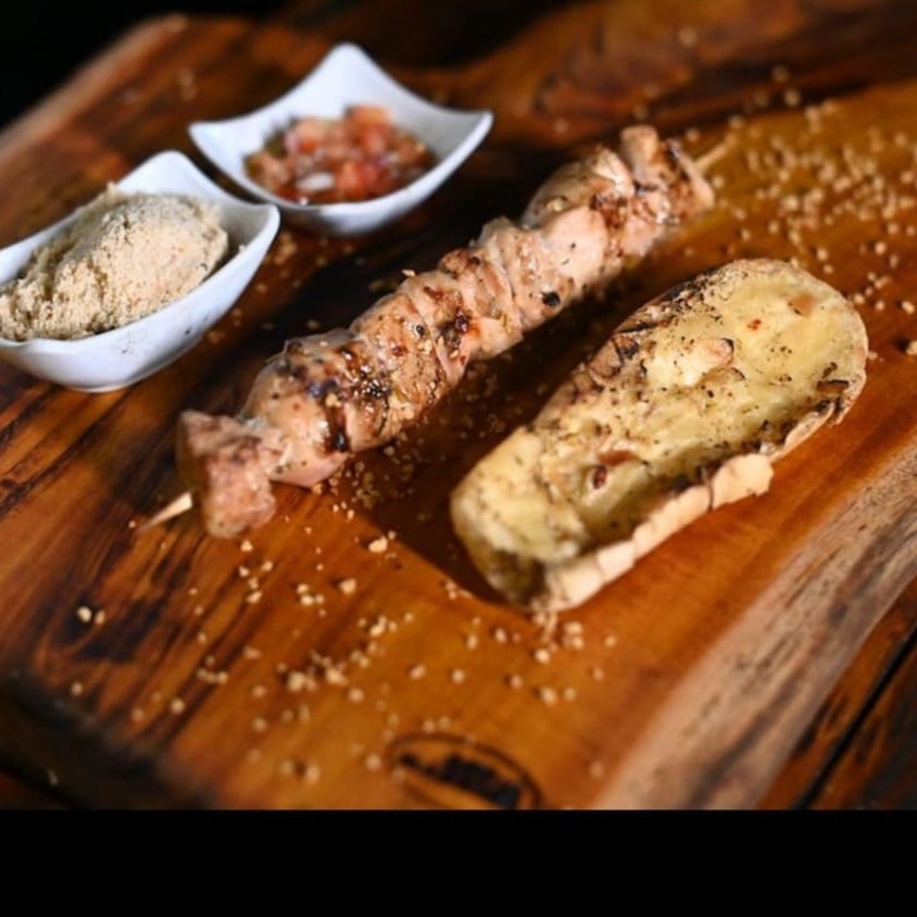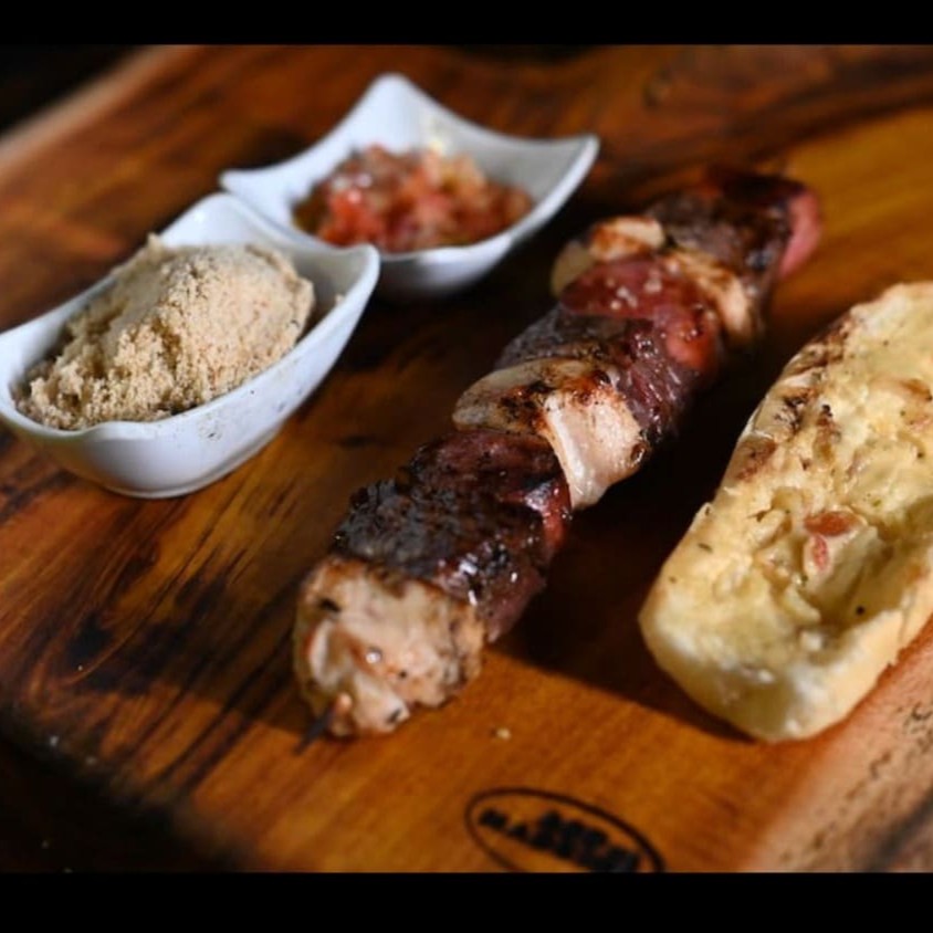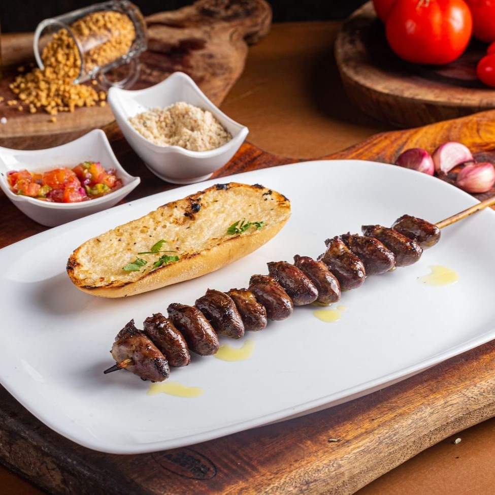 5 espetinhos (frangos, alcatra, coração, suíno e linguiça) acompanhamestos= molho, farofa e pão de alho Delicie-se com um mix perfeito de sabores do churrasco: frango suculento, alcatra macia, coração temperado, carne suína saborosa e linguiça grelhada no ponto certo. Para completar a experiência, acompanham molho especial da casa, farofa crocante e pão de alho dourado. Uma combinação irresistível para quem ama churrasco de verdade!
