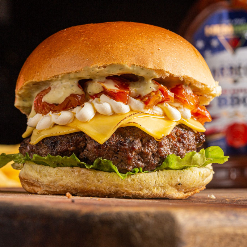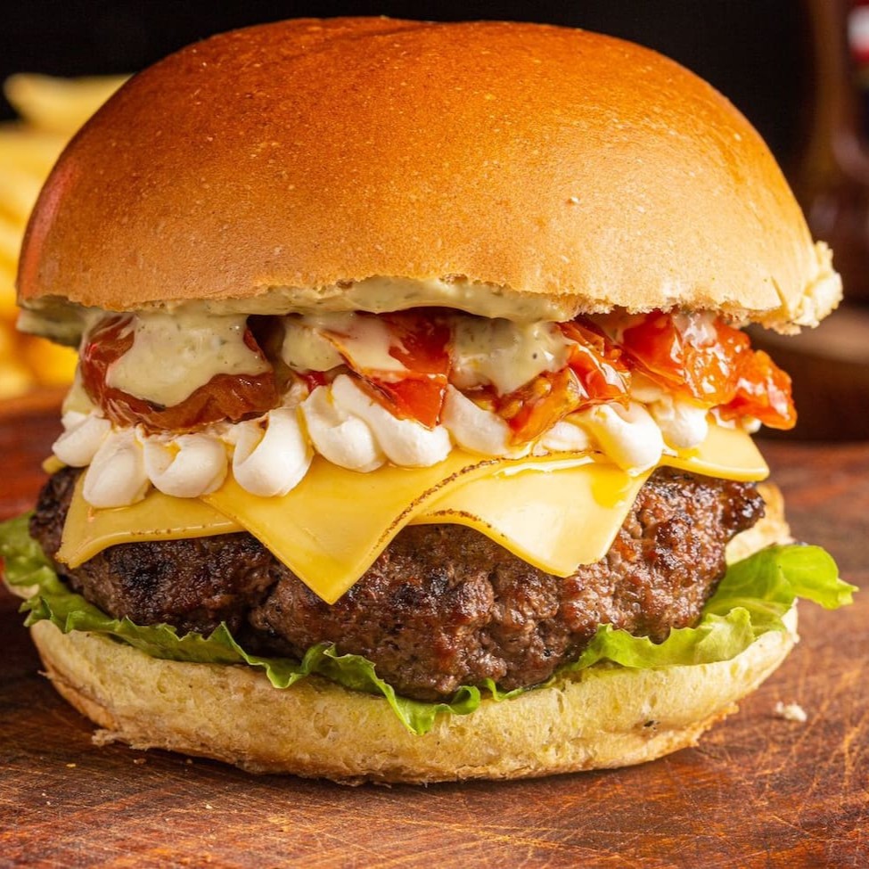 Blend Bovino (200g), tomate confitado, fatia de queijo gruyer, cream cheese, molho especial e alface americano. Sabor sofisticado e equilibrado! Blend bovino suculento de 200g, harmonizado com o toque adocicado do tomate confitado, a elegância do queijo gruyer, a cremosidade do cream cheese e nosso exclusivo molho especial. Tudo isso finalizado com a frescura crocante da alface americana. (Apenas o hambúrguer)