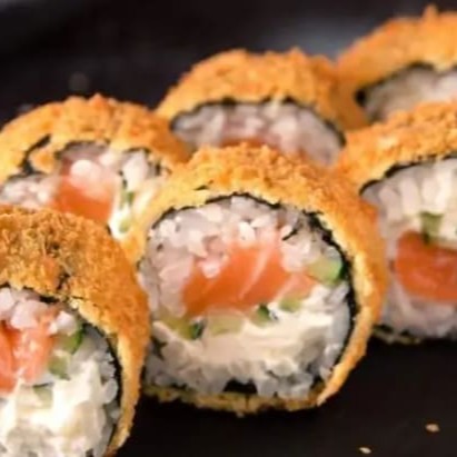 """Porção com 12 unidades de Hot Philadelphia, sushi empanado e crocante por fora, recheado com salmão fresco e cream cheese cremoso que derretem na boca a cada mordida. Preparado com arroz temperado na medida certa, é uma combinação irresistível de texturas e sabores, perfeito para compartilhar ou saborear sozinho."""