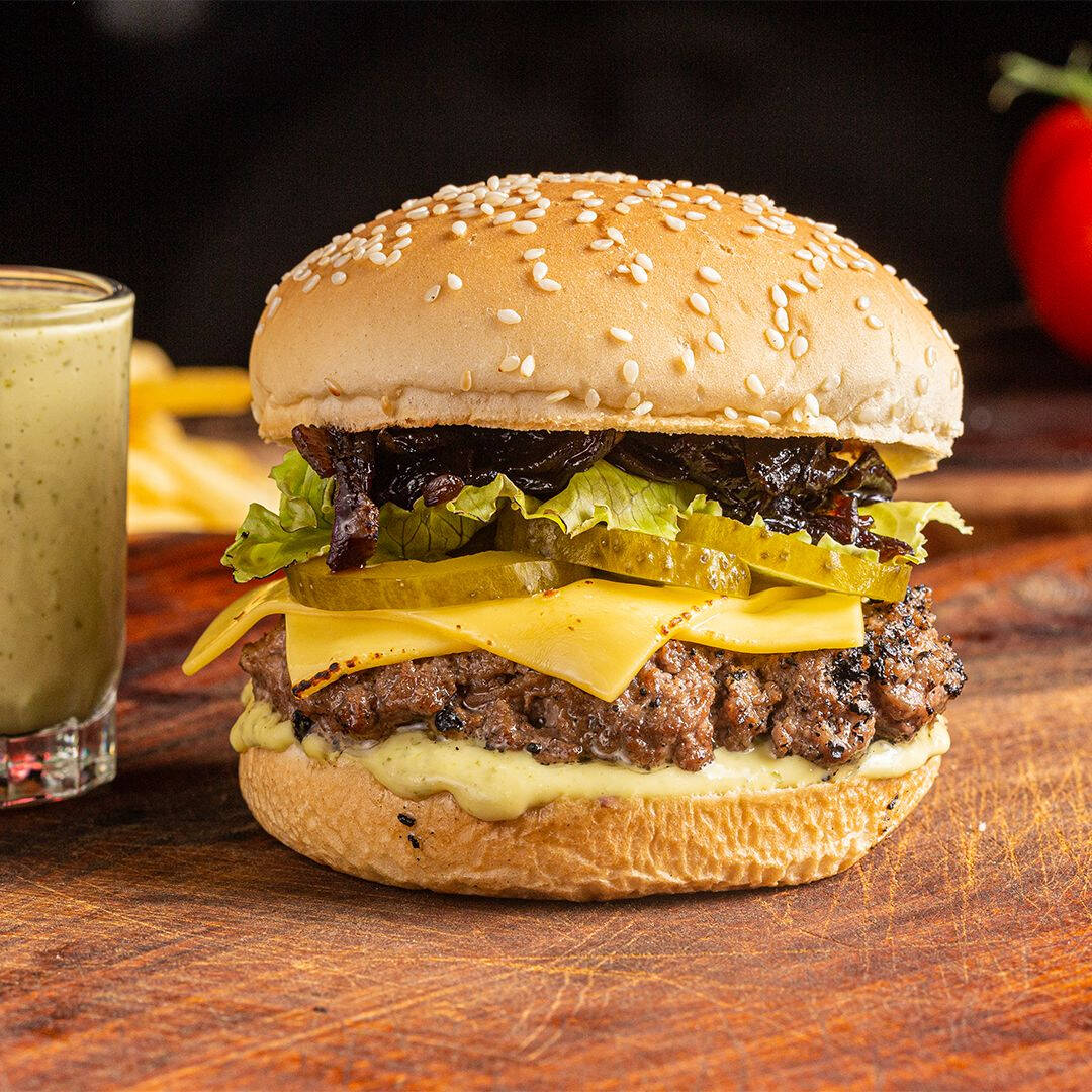 Blend Bovino (120g), molho especial, cebola caramelizada, fatia de queijo cheddar, alface e picles. Sabor na medida certa! Um suculento blend bovino 120g, grelhado no ponto perfeito, coberto com nosso molho especial irresistível. A doçura da cebola caramelizada se mistura à cremosidade da fatia de cheddar, enquanto a crocrância da alface e o toque marcante do picles completam essa experiência única. (Apenas o hambúrguer)