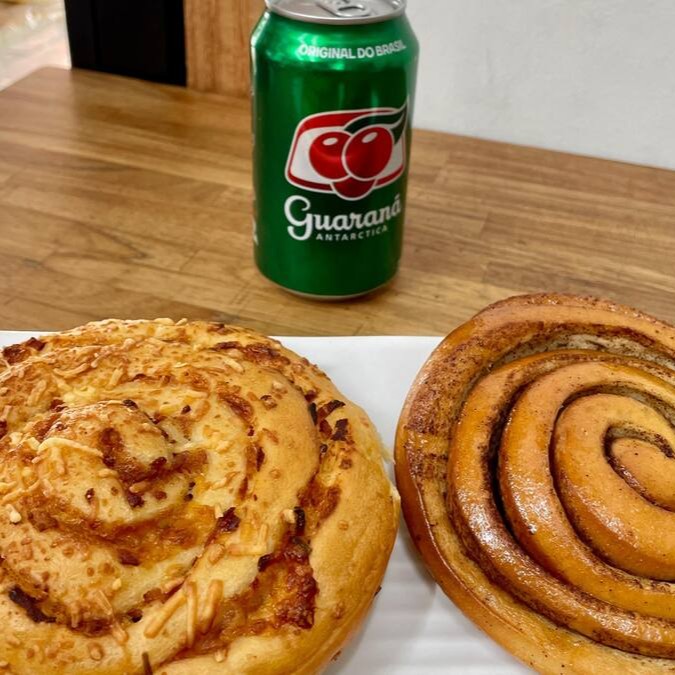 Combo Duo C&C! Cinnamon Roll + Roll de Calabresa e Queijo + Bebida. Perfeito para um lanche delicioso com opções doces e salgadas. Peça agora e aproveite!