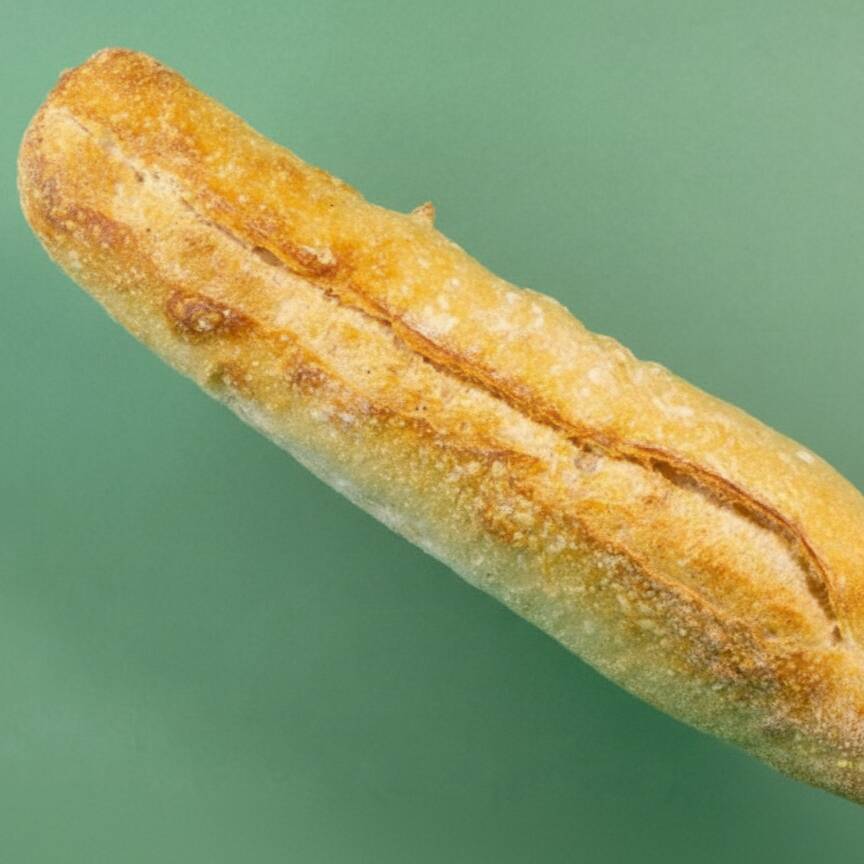A tradicional Baguette francesa, com uma crosta fina e crocante e miolo macio e leve.