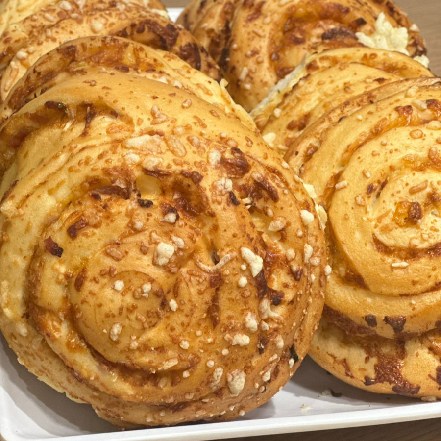 Pão feito com massa de fermentação longa leve, macia e amanteigada, enriquecido com pedaços de calabresa suculenta, cebola roxa e uma mistura de queijos como requeijão cremoso e queijo mussarela.