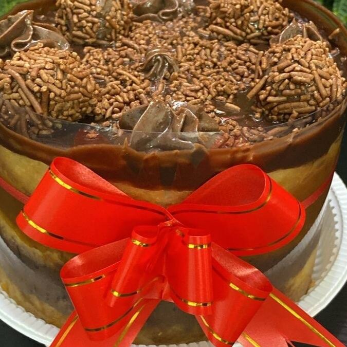 Massa branca com recheio de brigadeiro.Rende 8 a 10 fatias. Decoração sortida