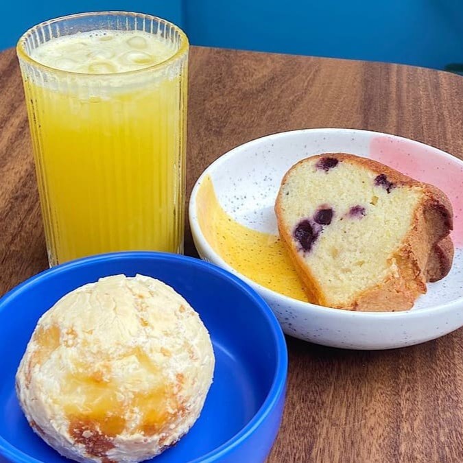- 1 bolo do Dia ou broa - 1 suco de laranja ou Mate - 1 pão de queijo purin