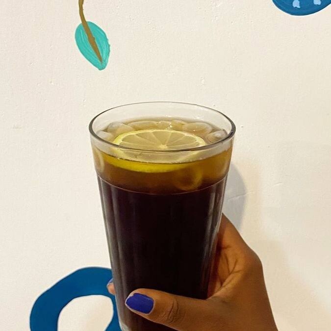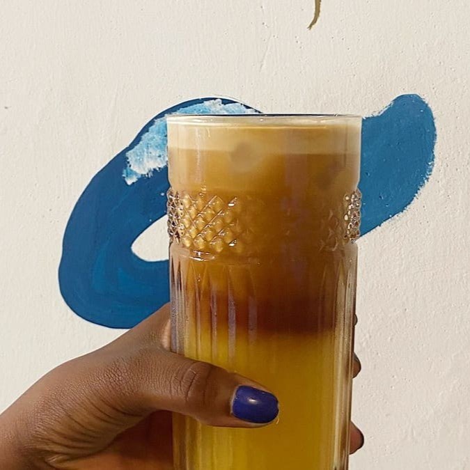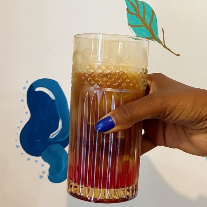 Um delicioso café espresso longo com suco natural de laranja e gelo.