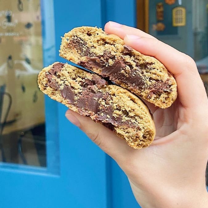 Cookie enorme com gotas de chocolate ao leite com recheio de brigadeiro mole! Coisa boa demais!