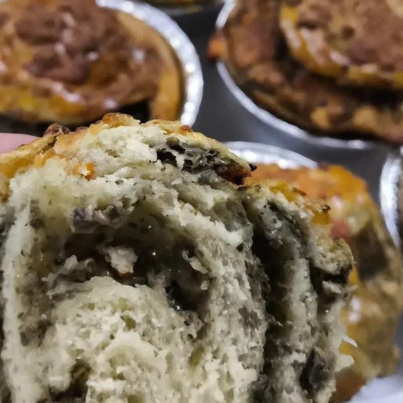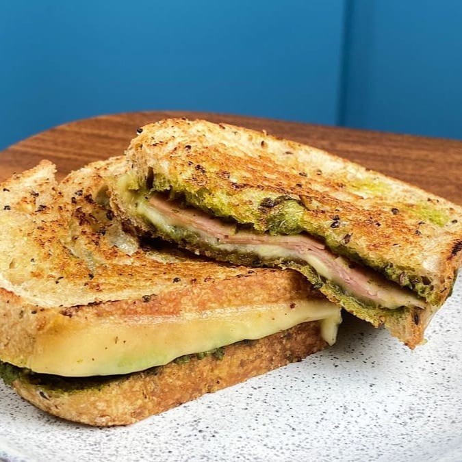 Sandubão de pão sourdough de fermentação natural com queijo, presunto e pesto de manjericão| *Pode conter castanhas na massa*