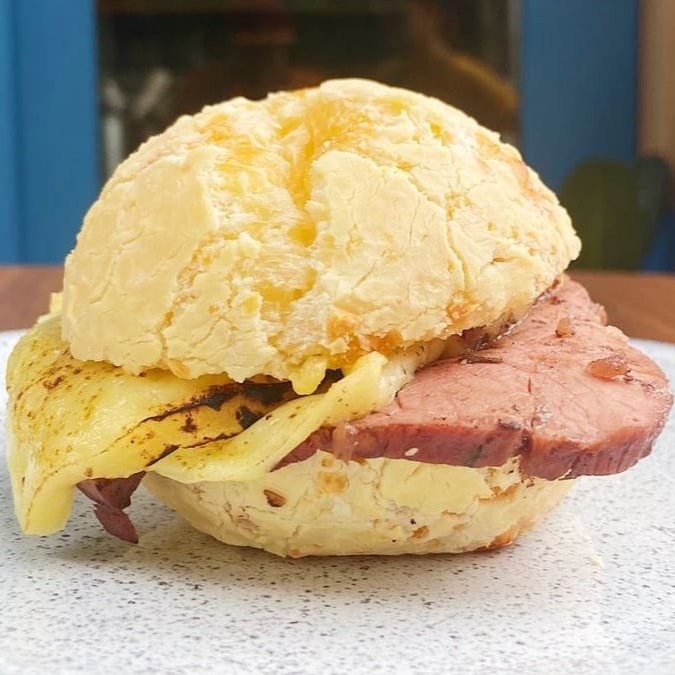 Sanduiche de pão de queijo com nosso pernil marinado e queijo canastra
