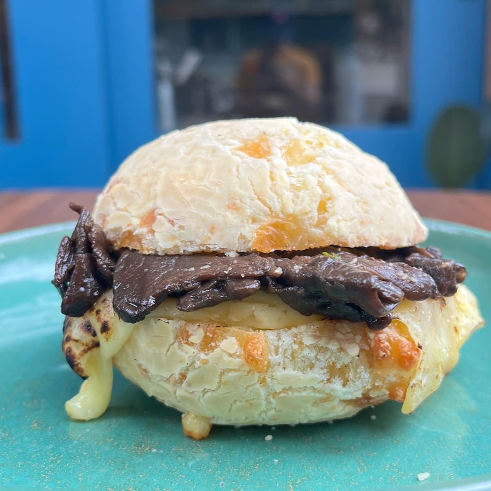 Sanduíche de pão de queijo recheado com cogumelos salteados na manteiga e queijo canastra.